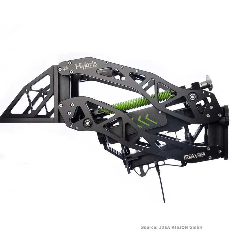 A finely balance and adjustable linear eddy current brake and spring system gi- ves you a stable platform from which to shoot. The fact that it operates without contact means it is wear-free and unaffected by wheather conditions. It can be applied with great precision. The damping performance is controlled via Hybris- App.