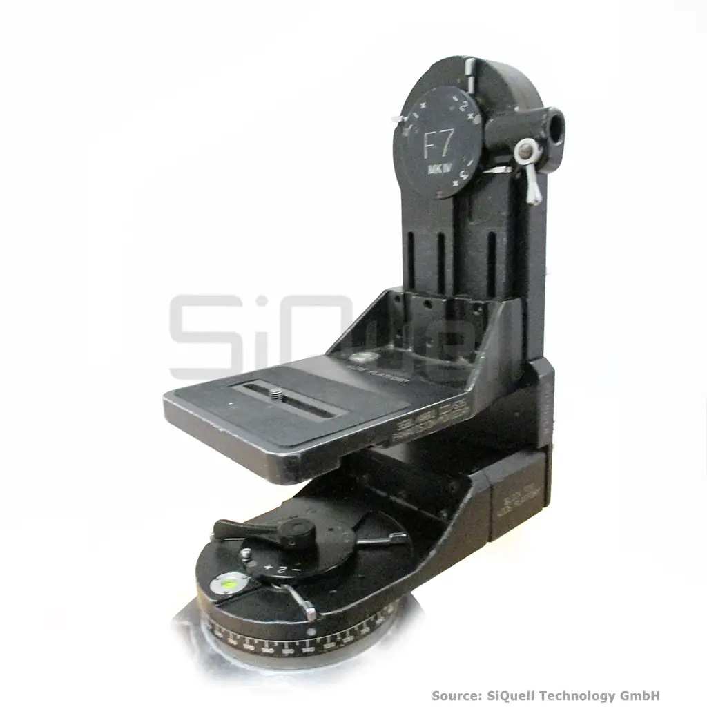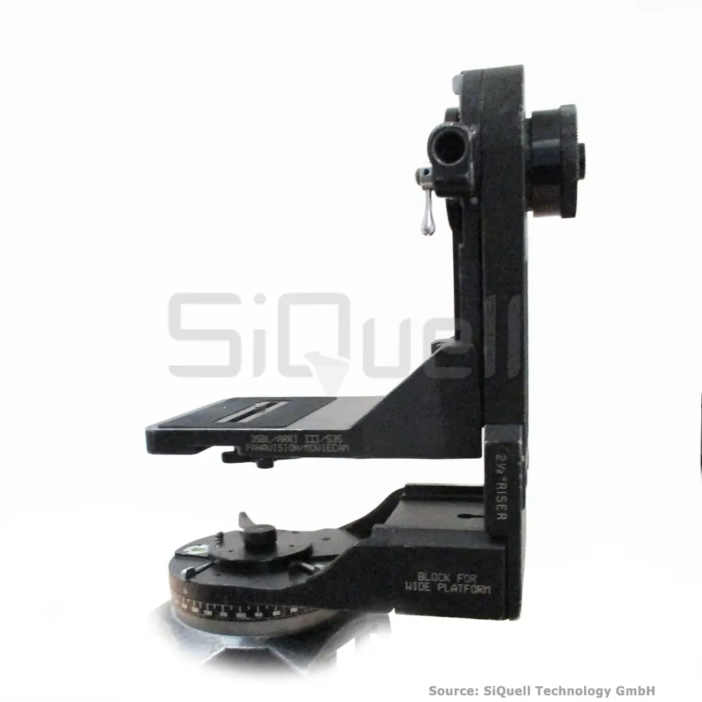 The Ronford-Baker Fluid 7 head is designed for use with film or video/EFP cameras. Its two sealed fluid units allow control to be varied through seven stages, from a cushioned free movement to the heaviest control required, by the use of three simple on/off levers. Both pan and tilt actions are continuous through 360 º, depending on the length of the lens and camera. The platform is adjustable for height to suit the centre of gravity of the camera in use. A second pan bar of the platform, with ratchet adjustment to suit the required height.
